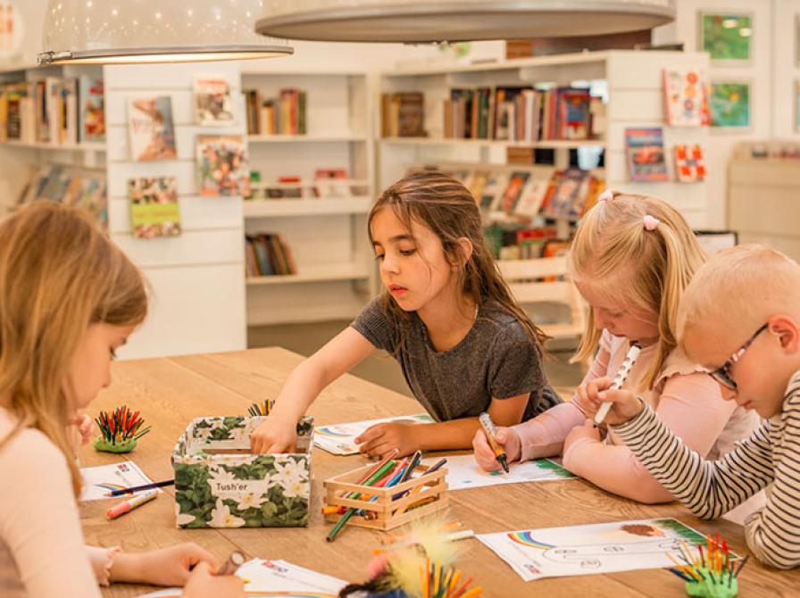 Åbent værksted for børn med voksen hver tirsdag ved langbordene i børnebiblioteket. Vi sørger for idéer, skabeloner og materialer.