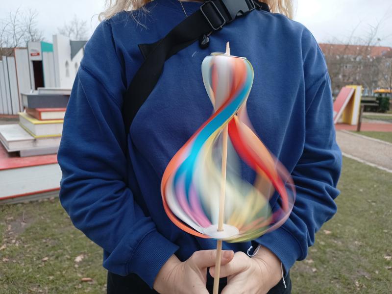 Gladsaxe HovedbibliotekMed træpinde og pap i alle regnbuens farver kreerer vi kæmpe snurretoppe.