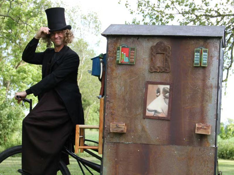 En mand, Andersen, kommer cyklende forbi med sin fortællevogn. På vognen står hele hans hus. Huset er fyldt med låger, billeder og alle mulige ting.