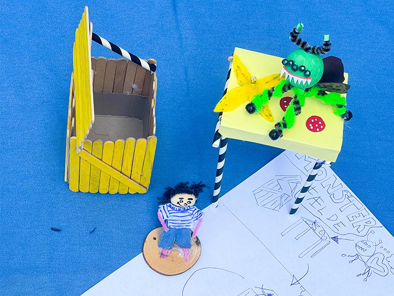 Vi starter med at tegne fælden på papir, inden vi klipper og klistrer fælden ud af pap, ispinde, genbrugsmaterialer og meget andet. Og så skal vi selvfølgelig teste, om fælden virker på vores egne monstre.