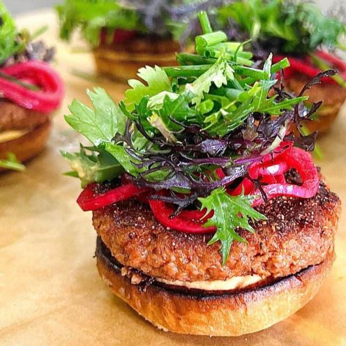 Vegetar Bøf med Vores Hemmelige Dry Rub Blend – Cheddar – Chipotle - Hjertesalat – Tomat – Hibiscus syltede løg