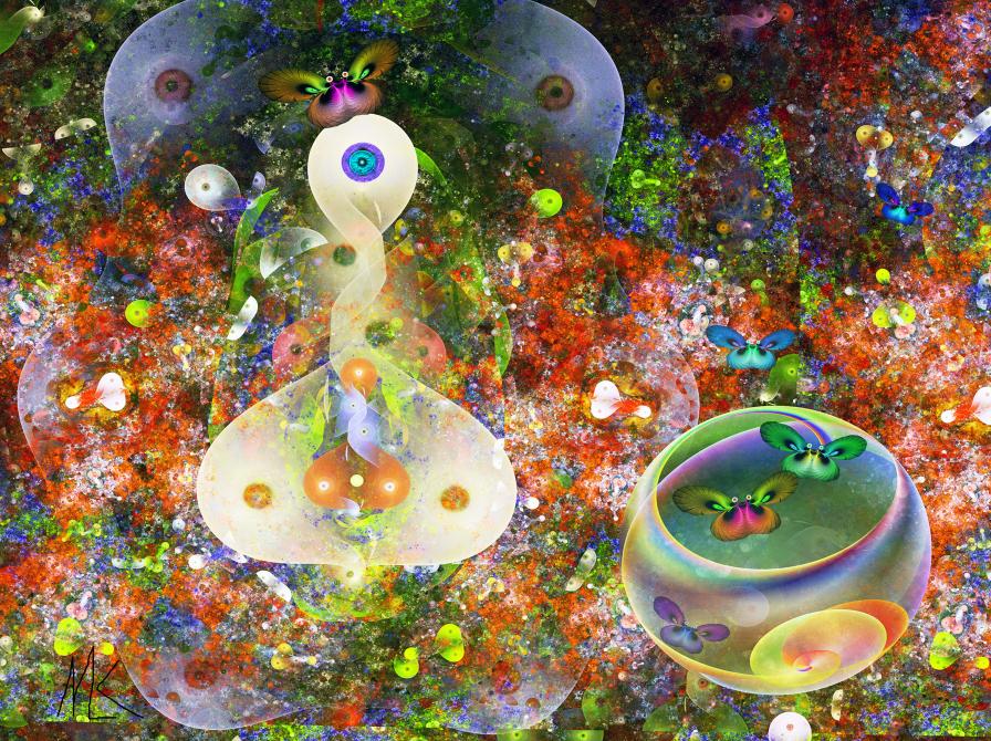 Mine malede motiver – og/eller fotos - kombineres ofte med fraktalbillederne til Mixed Media (scannes ind på computeren.).